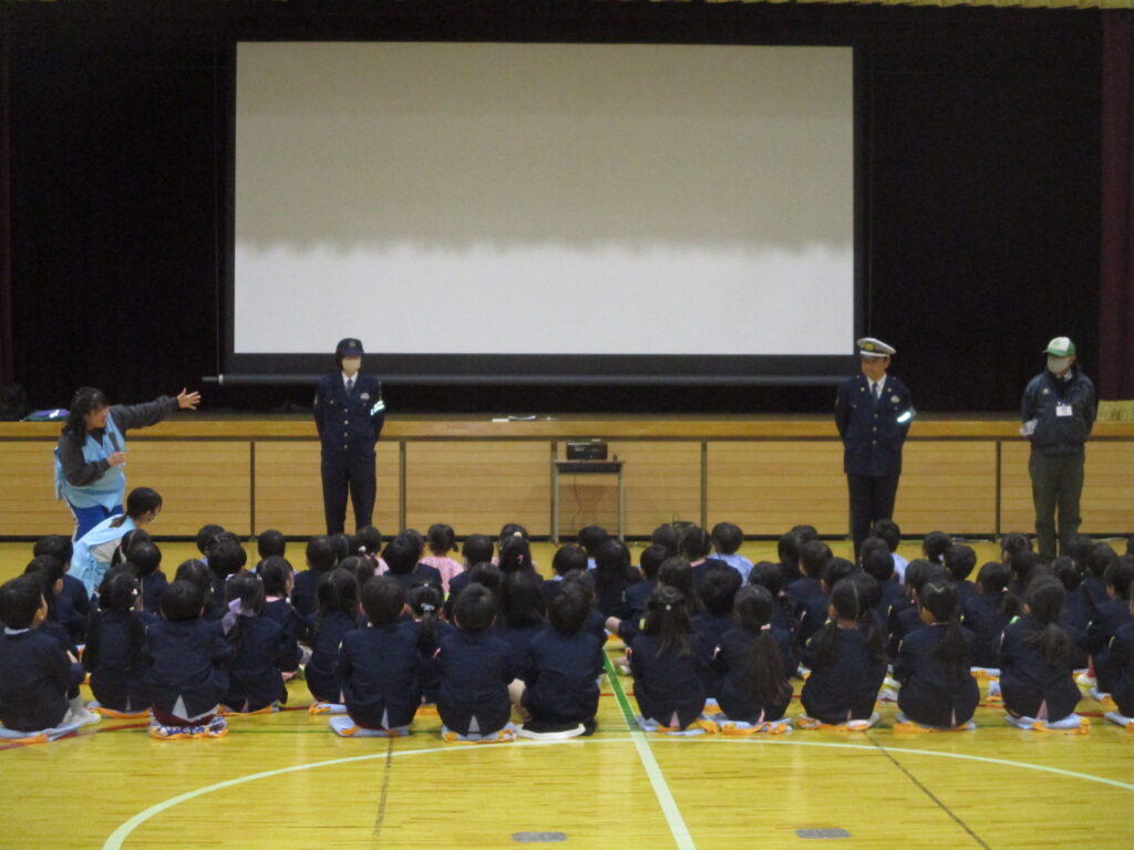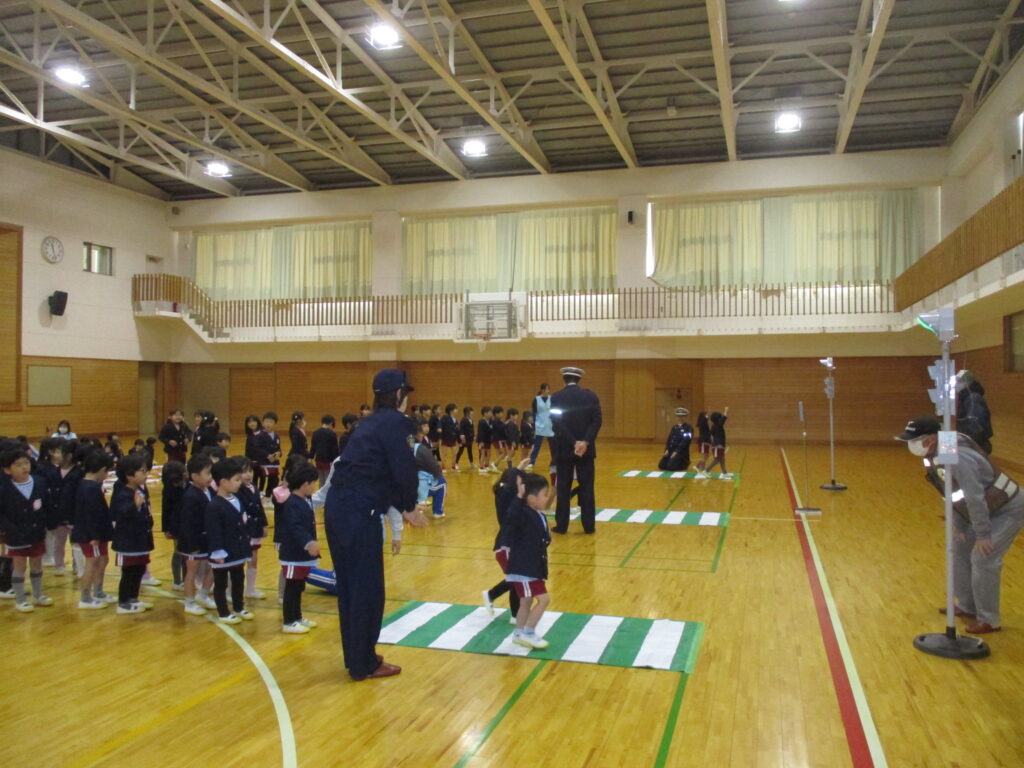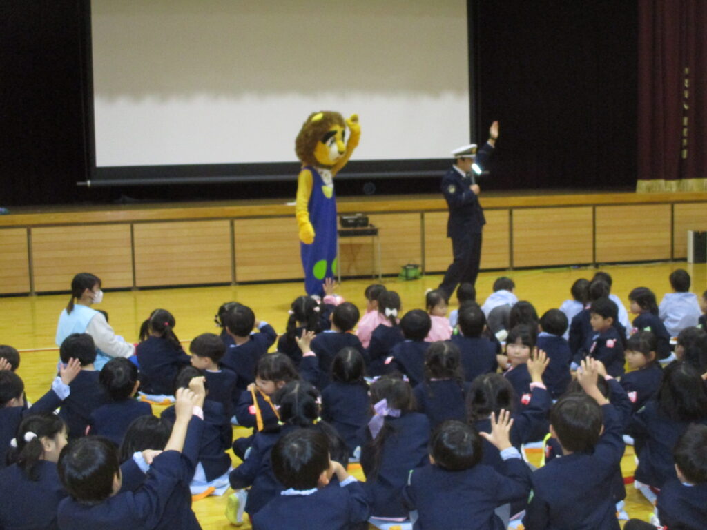 体育館に集まり、保土ヶ谷警察と県警本部のお巡りさんにお越し頂き、交通ルールについてライオンのガオガオ君と一緒に学びました。道路を歩く時は「おうちのひととてをつなぐ」、道路には絶対に「とびださない」など、お約束をしました。年中組と年長組は横断歩道の正しい渡り方も実践しました。もうすぐ冬休み、交通事故に遭わないよう十分気を付けましょう‼️