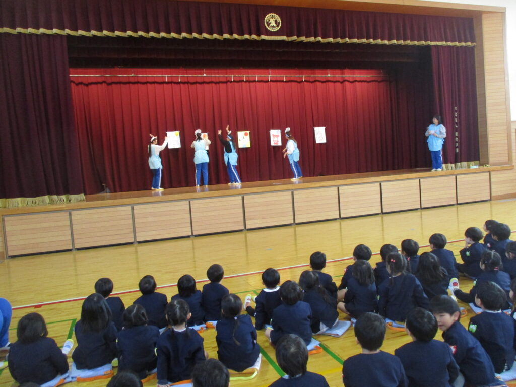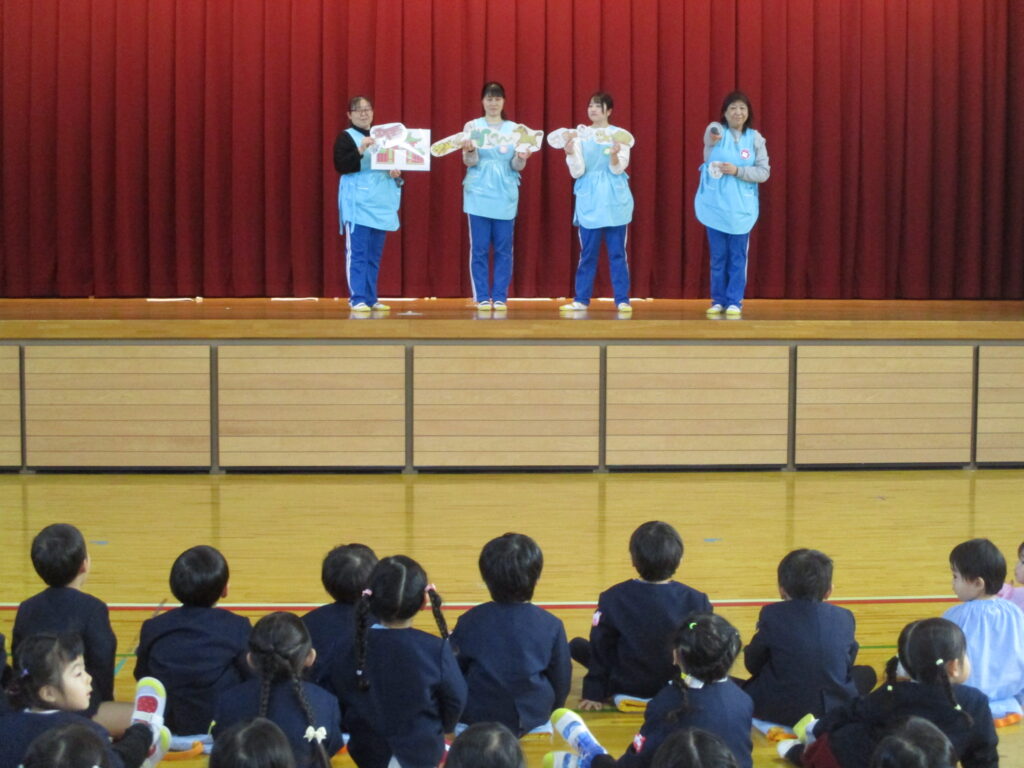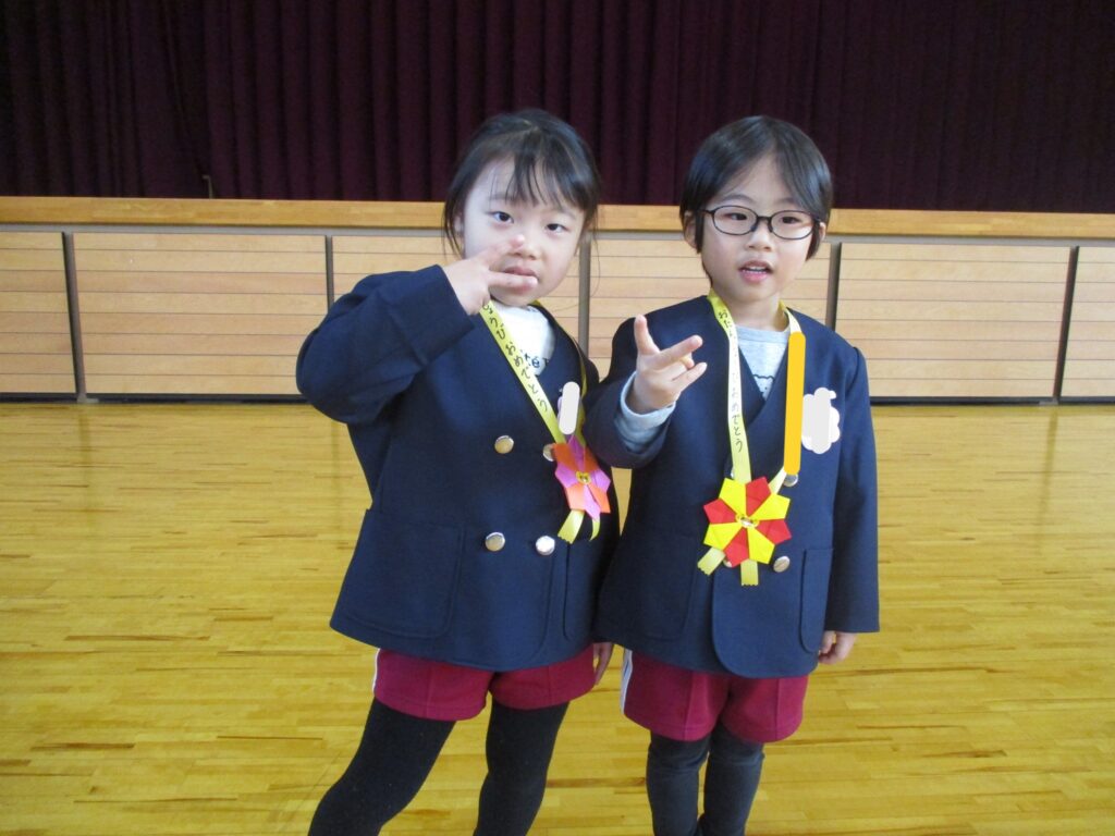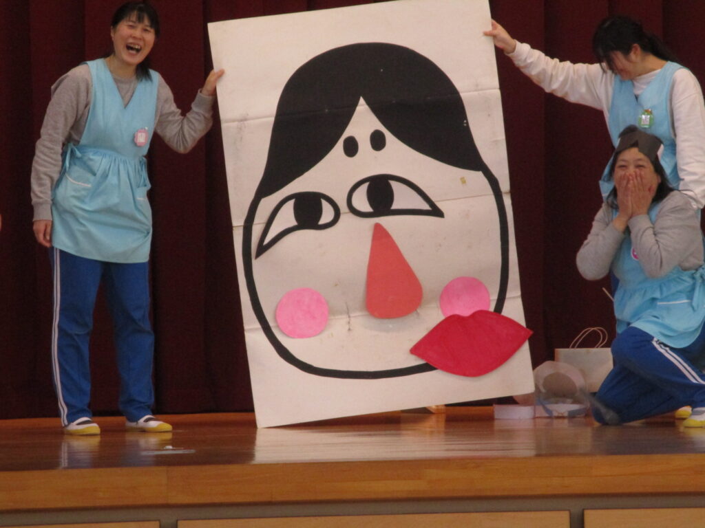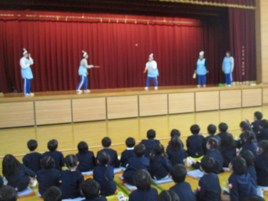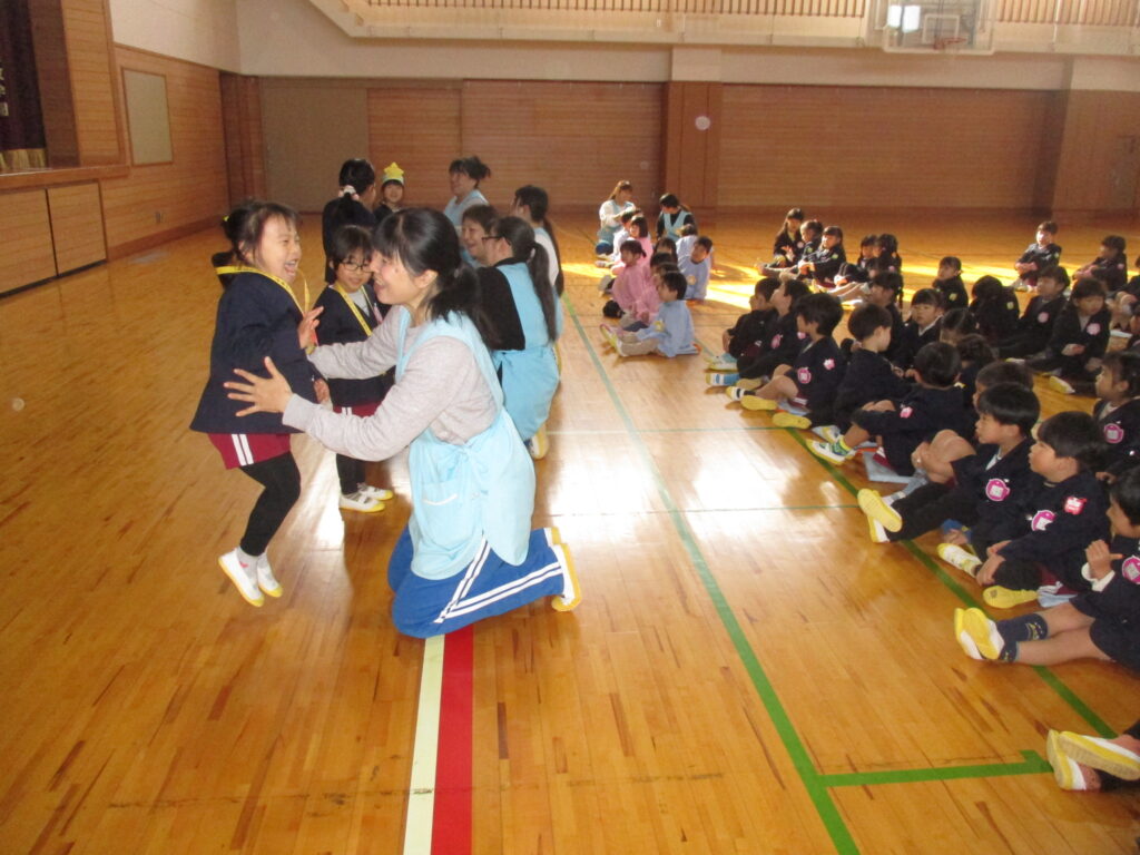 体育館に集まり、元気に体操をした後、1月生まれのお友だちのお誕生会を行いました。みんなの前に並び、担任の先生から手づくりペンダントやかんむりを頂きました。今日は、新しい年を迎えて初めての誕生会でしたので、お正月遊びにちなみ、干支の話を聞いた後、かるた遊びや羽根つき、また福笑いを先生方が披露しました。福笑いでは子ども達に誘導してもらい、できた顔にみんな大笑いでした‼️
