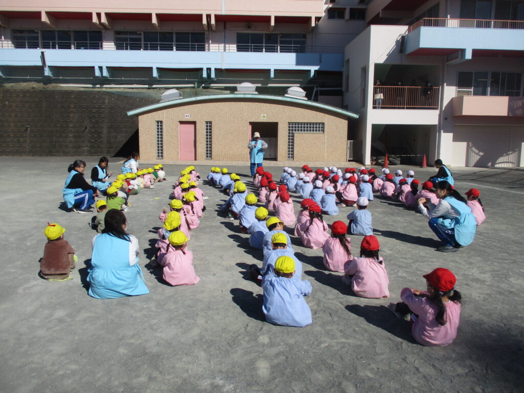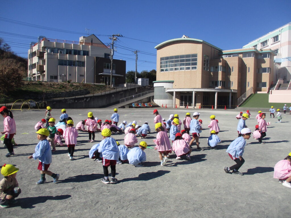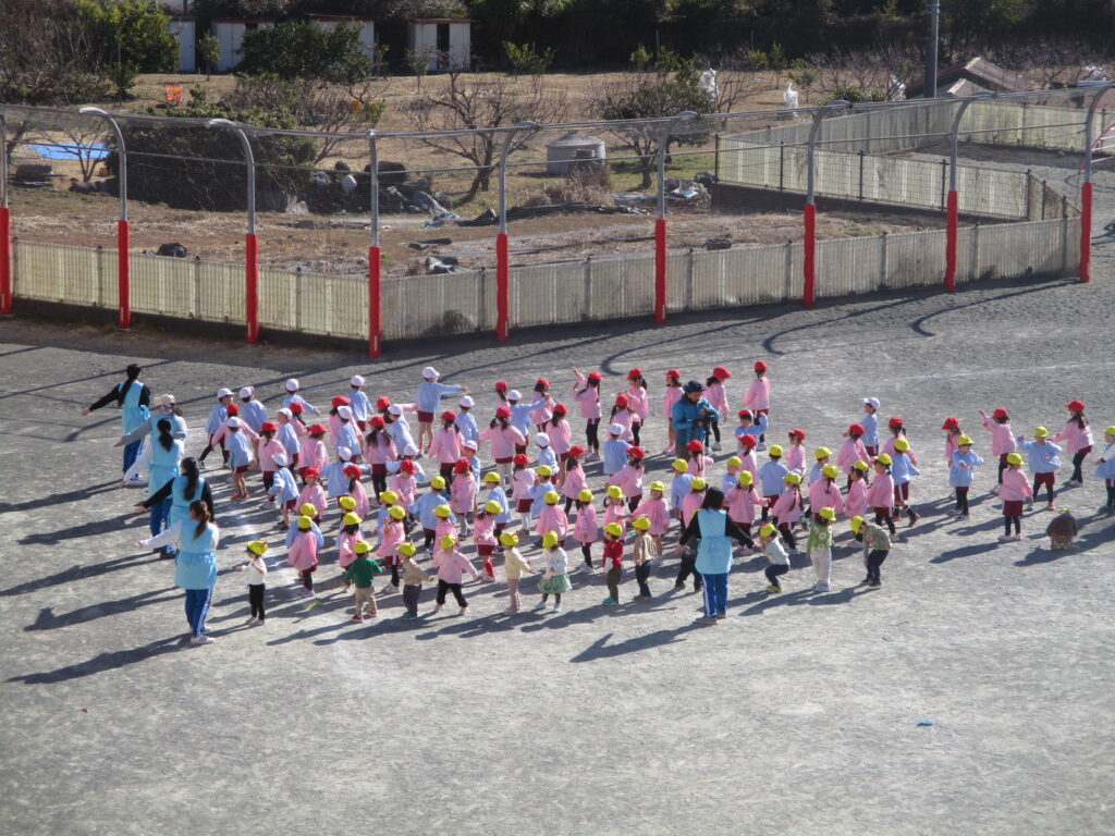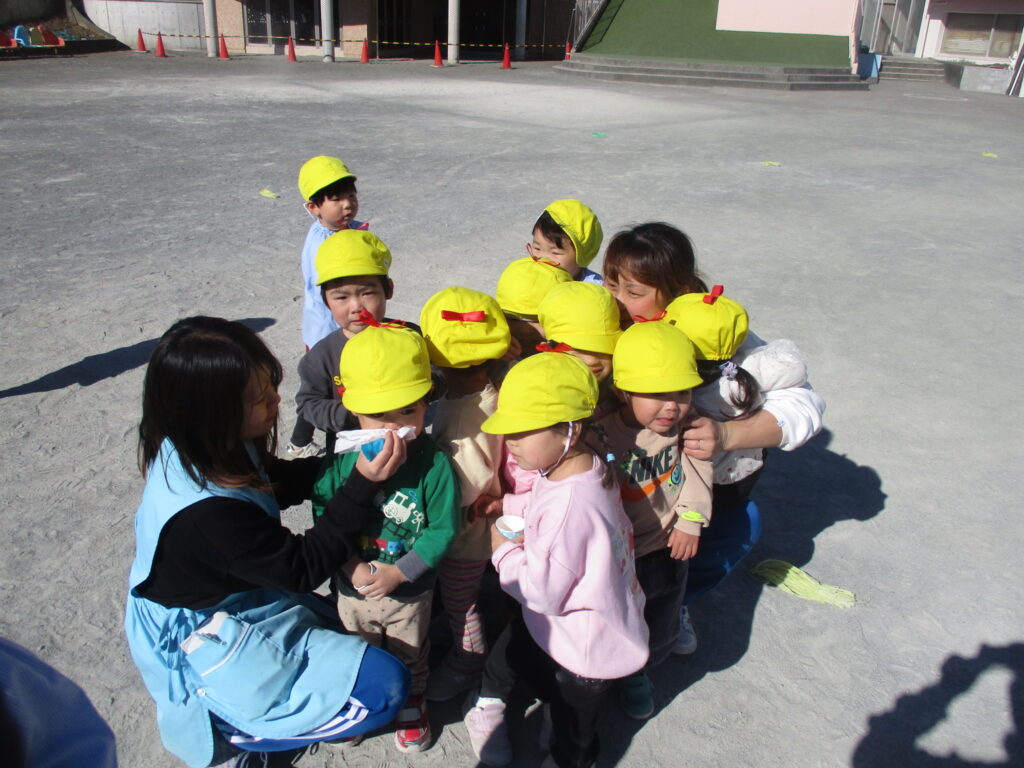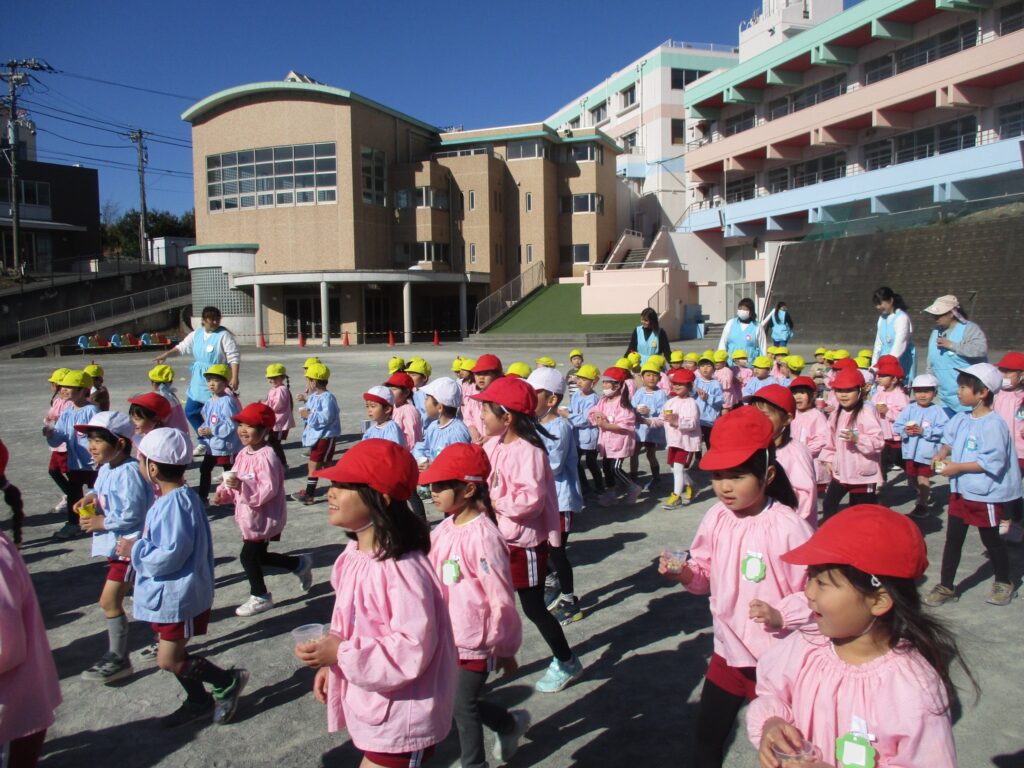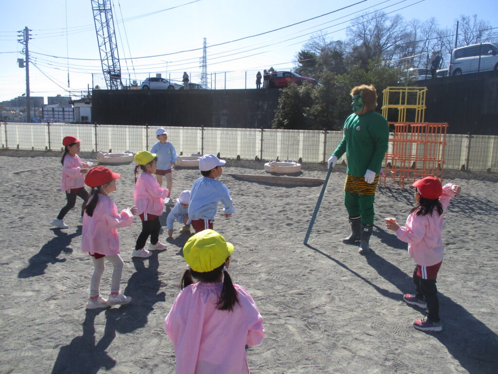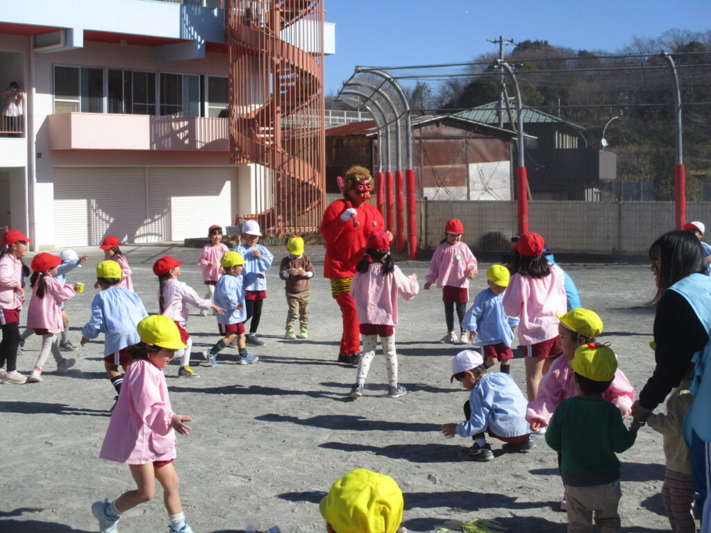 朝の体操の後、節分についての話を聞き、みんなで豆まきをすることにしました。新入園児にとっては初めての豆まき、進級園児も去年の記憶がよみがえるようで少々緊張気味でした。先生からカップに入った豆をもらい、鬼はどこから来るか探しに行くと、反対側から赤鬼と緑鬼がやってきました‼️「おにはそと。ふくはうち」と大きな声で鬼を退治しました👹最後は園庭に落ちた豆をみんなで拾いました。これでまた1年健康に過ごすことが出来ますね😊