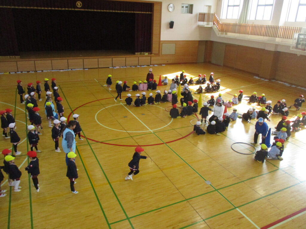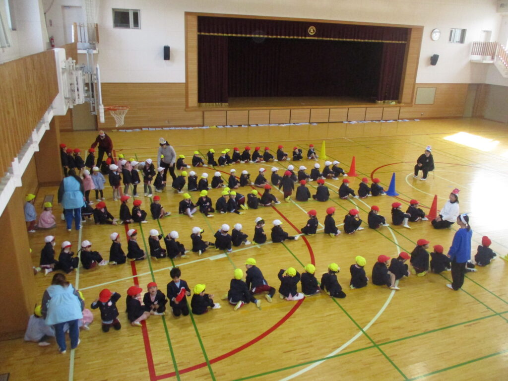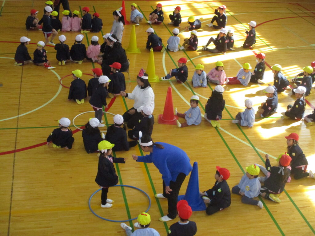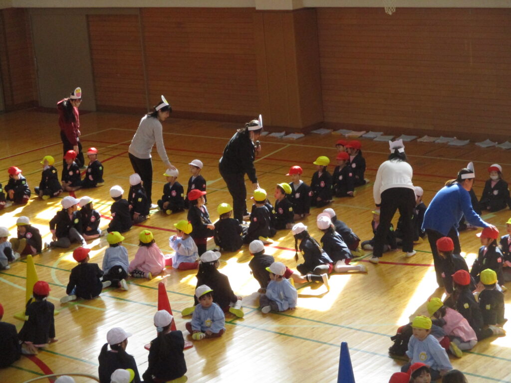 体育館に集まり、2月生まれのお友だちをお祝いしました。担任の先生から手づくりペンダントやかんむりを頂き、お友だちからはことばのプレゼントを頂きました🎉2月は、学年ミックスで5チームに分かれみんなでゲームをして遊びました🎵